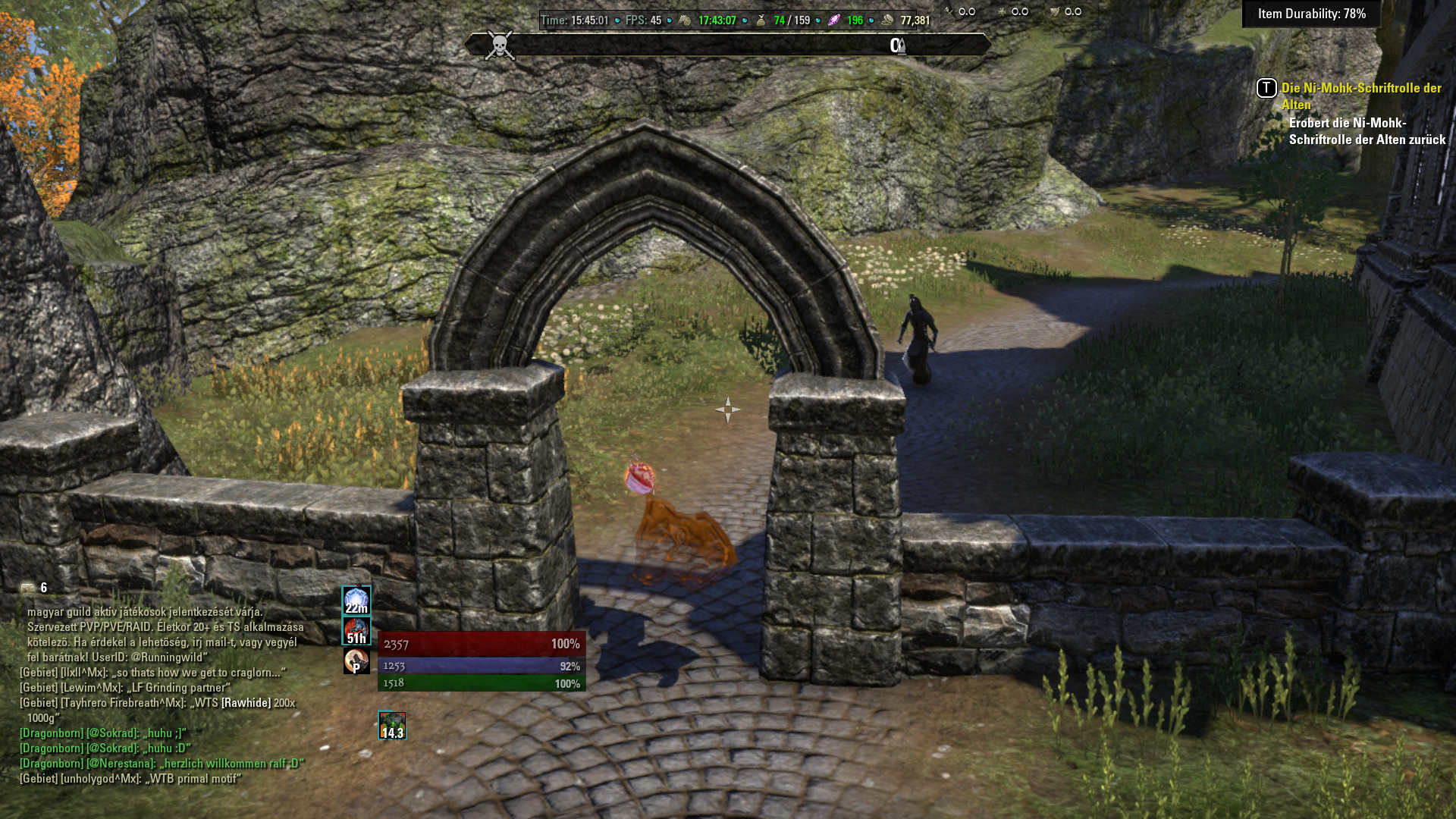 ich habe mir vor einer guten Stunde den neuen Patch gezogen und mich auf nach Craglorn gemacht. Dort haben wir als Gruppe angefangen die Anomalien zu beseitigen und dabei ist ein eigenartiger Grafikbug aufgetreten. An sich nicht so wild, aber mir ist aufgefallen, dass mir alle semi-durchsichtigen Modelle nicht mehr dargestellt werden, also Geister oder Erscheinungen, z.B. wenn ich mit dem Dragonknight die Fähigkeit Drachenblut benutze verschwindet der Charakter einfach, was ich noch sehe sind Waffe, Herz und Schatten. :(