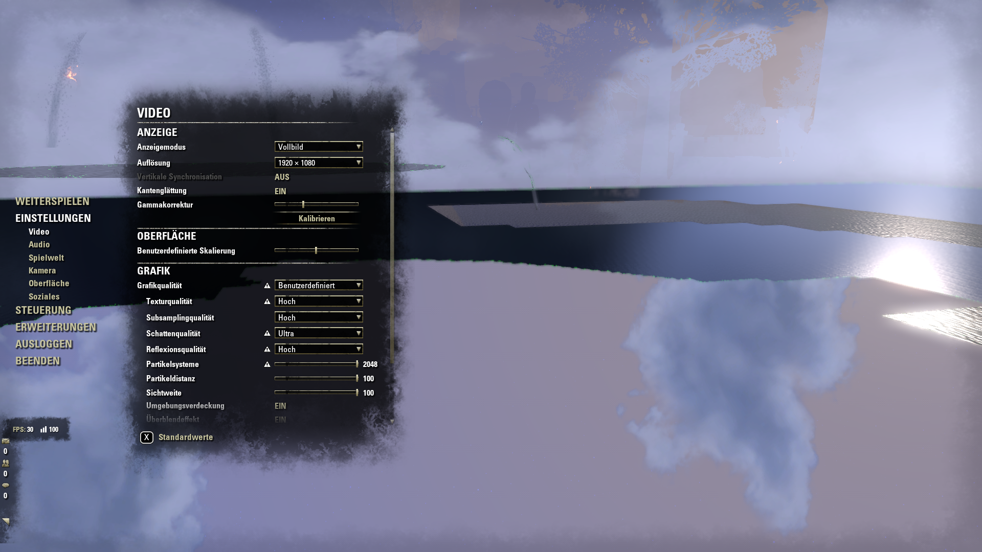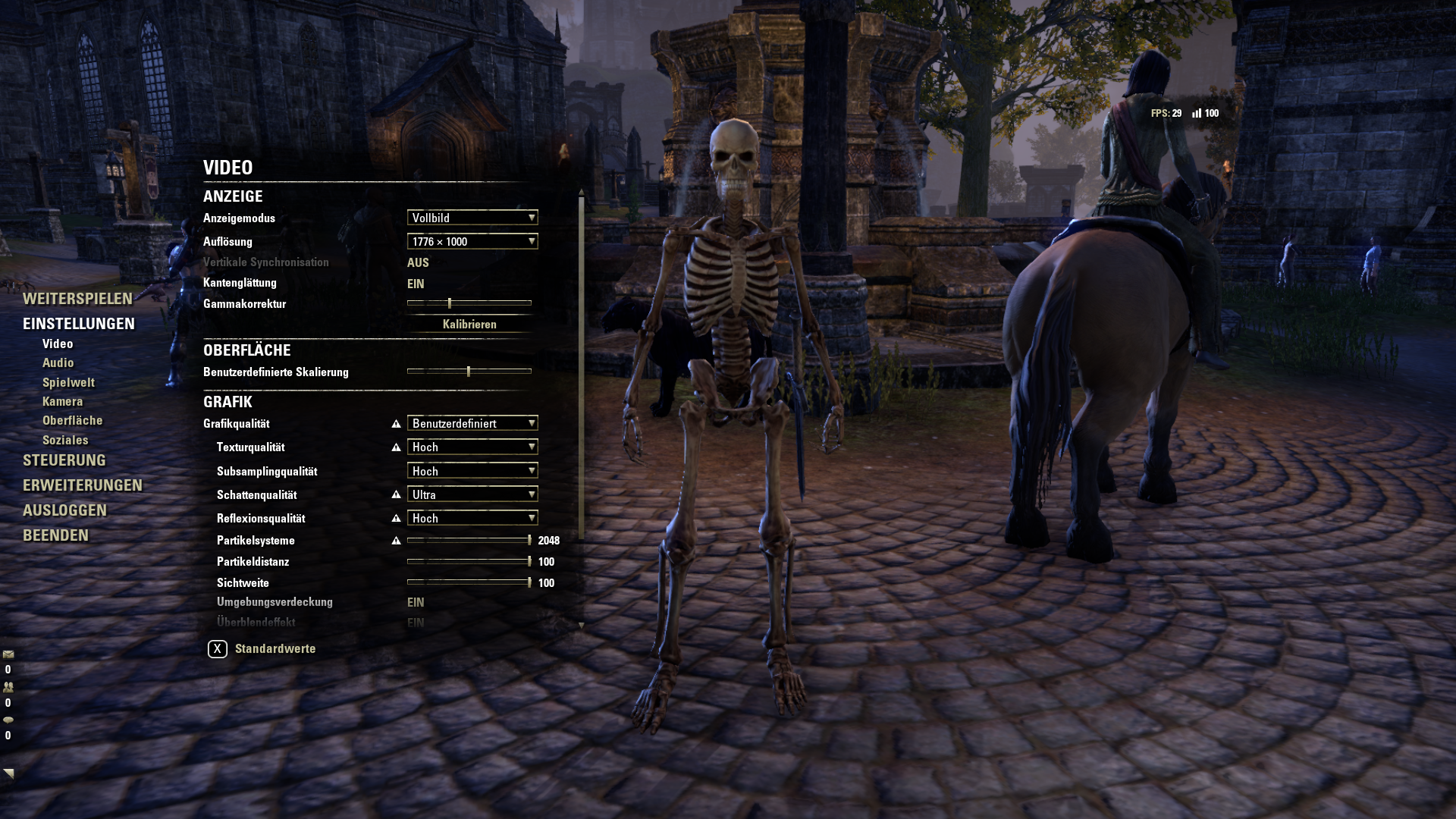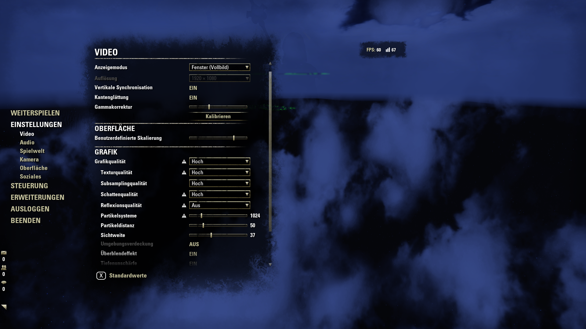 Nur als Randbemerkung: Die Einstellungen Partikelsysteme und -distanz müssen nicht auf Anschlag stehen. Selbst in der geringsten Einstellung werden noch alle für deinen Charakter relevanten Partikel-Effekte gerendert, auch die, die du selbst in der Entfernung verursachst. Die Einstellungen Schattenqualität: Ultra und Reflexionsqualität: Hoch sind wahre Ressourcen- und Performance-Fresser. Beide auf Einstellung Mittel sorgt für höhere FPS und lässt das Bild auch nicht viel schlechter aussehen, insbesondere wenn damit die native Bildschirmauflösung erreicht werden könnte. Eine geringere vom Spiel gerenderte Auflösung wird nämlich vom Monitor hochskaliert und sieht, wie du schon bemerkt hast, richtig bescheiden aus.