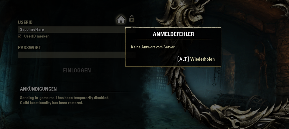 Jedoch seit gestern, nach der Downtime und dem damit verbundenen Patch des Servers, bekomme ich immer die Nachricht "Keine Antwort von Server", obwohl dieser ja online sein sollte. Einloggen nicht möglich, mein Freund der auch auf NA spielt kann sich jedoch einloggen.