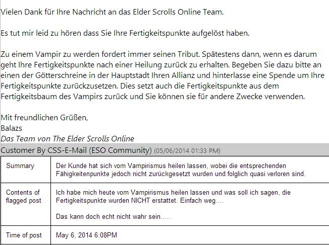 Ich hatte mich vom Vampirismus heilen lassen und dann bemerkt, dass mir die Fertigkeitspunkte aus besagter Skilllinie nicht erstattet wurden. So weit so gut. Es wurde ein Ticket eröffnet und nach sage und schreibe einer Woche erhalte ich eine Antwort.