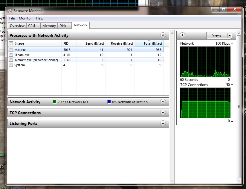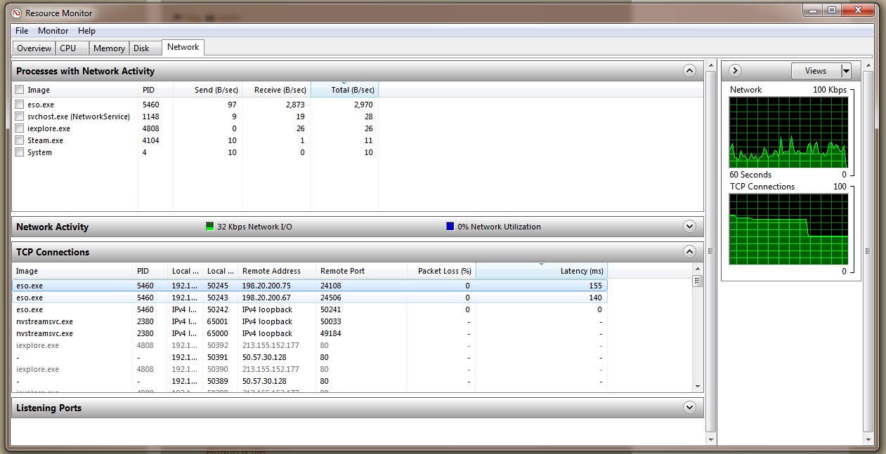@TomLowi, leider ist diese Ansicht im Resourcenmonitor nicht so interessant. Erweitere mal den Abschnitt "TCP Connections", suche dort den Prozess "eso.exe", und schau dir an, was in der Spalte "Packet loss" (Paketverlust) und "Latency" (Latenz) steht. Das ist schon aufschlussreicher.