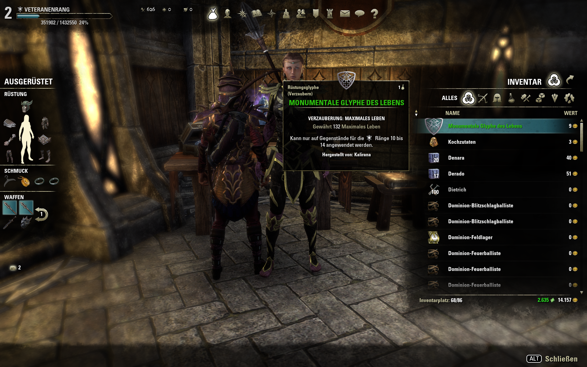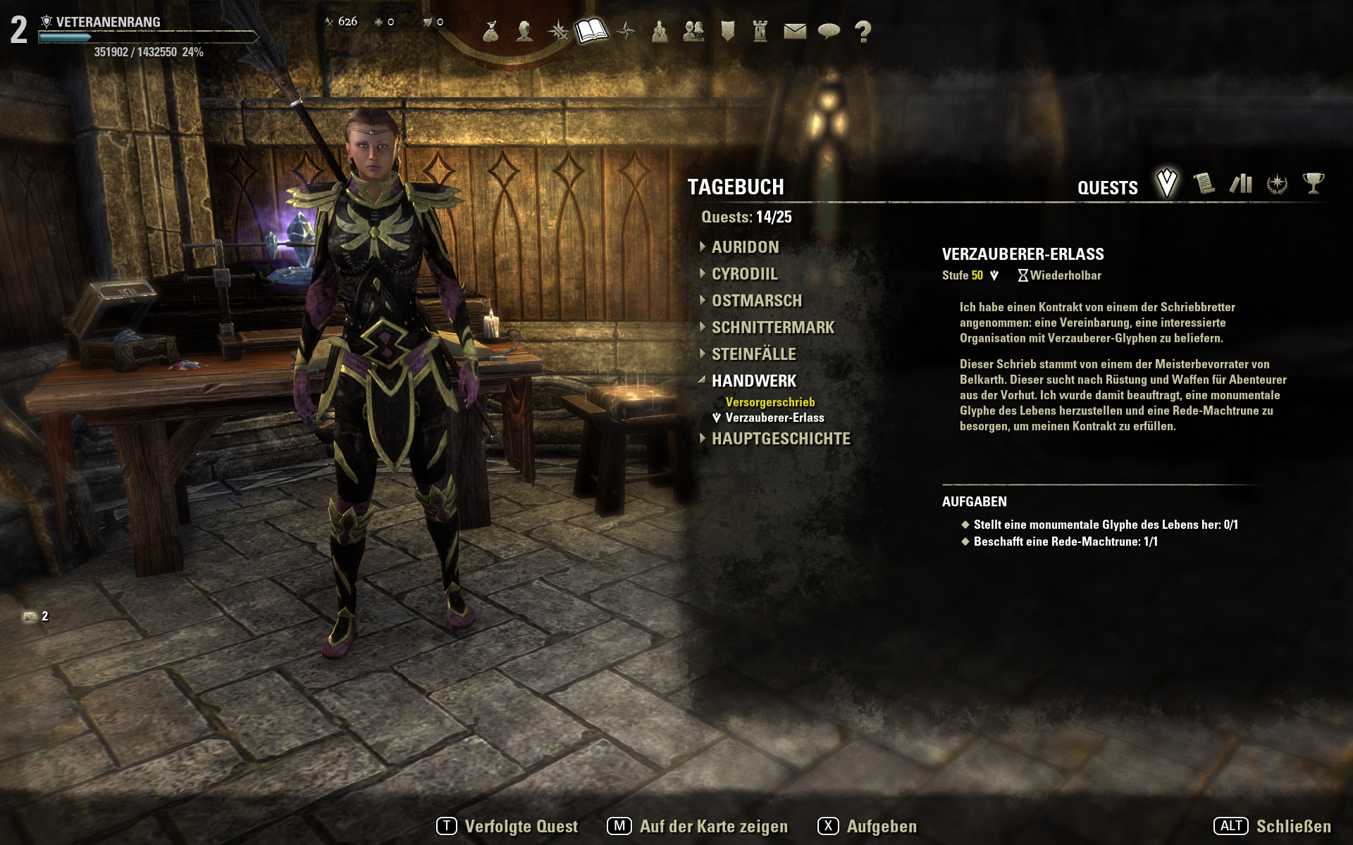 ich wurde im Verzauberer-Erlass u.a. aufgefordert eine Monumentale Glyphe des Lebens herzustellen. Habe ich getan, aber es wird nicht für die Quest angerechnet.