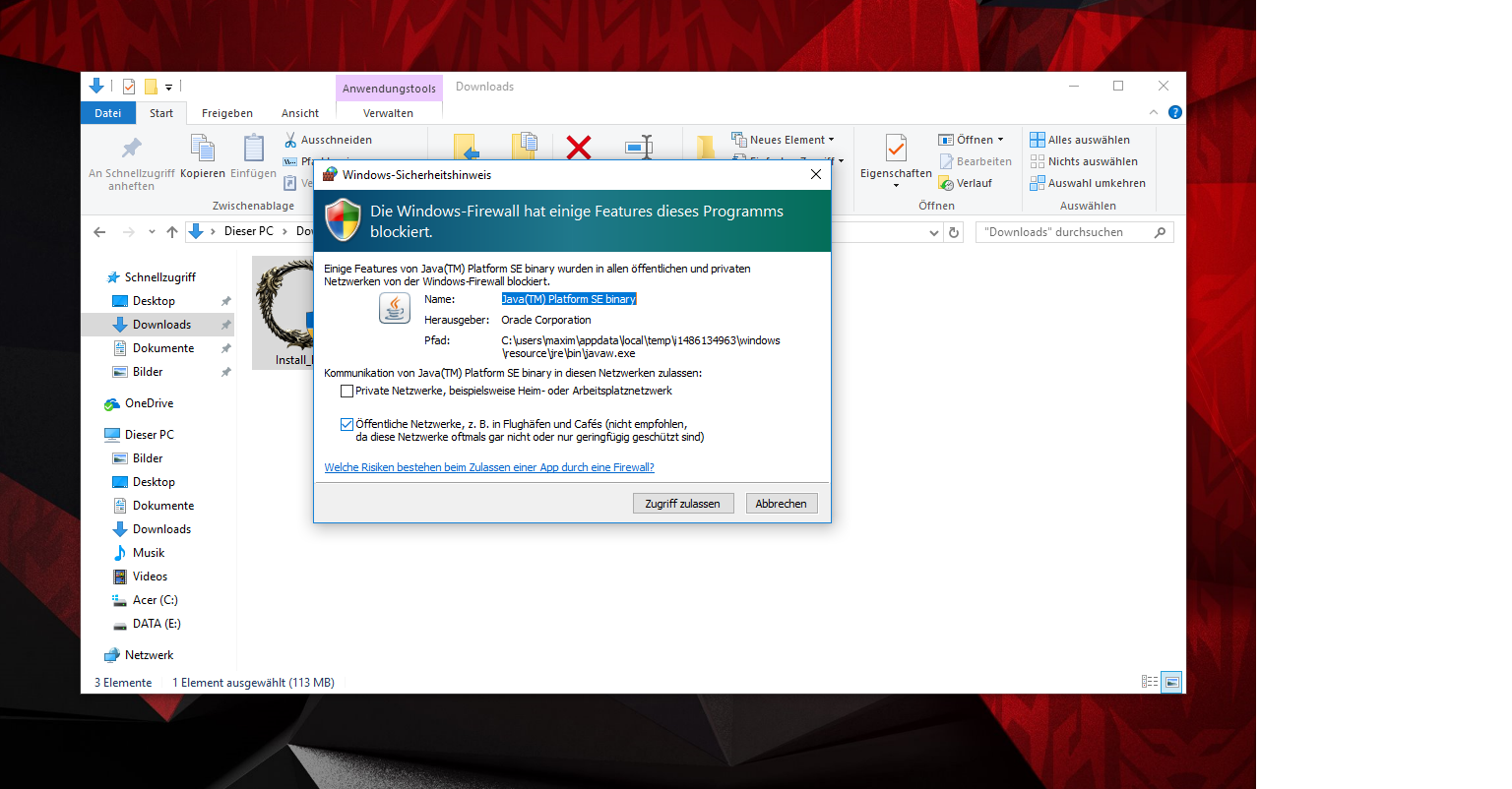 Habe euch auch ein Bild hinzugefügt, das kommt immer nachdem ich den " Install_ESO.exe " ausgeführt habe dann drück ich auf Zulassen aber es kommt danach nichts.. Habe auch den Windows Firewall und mein Antivirus komplett ausgeschaltet und nochmal die Install_ESO.exe ausgeführt aber immer noch das gleiche.