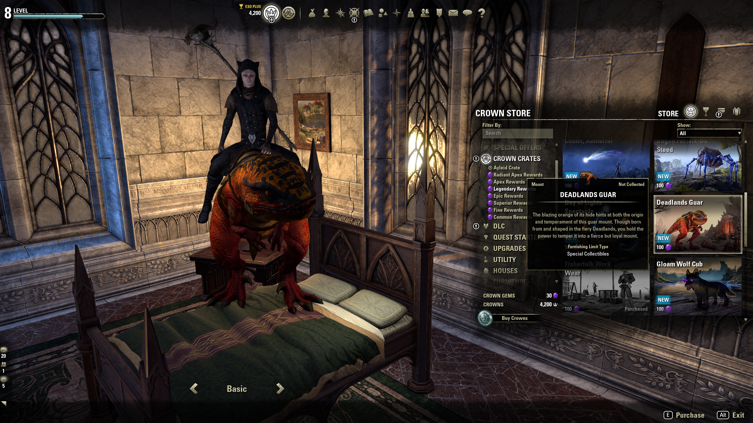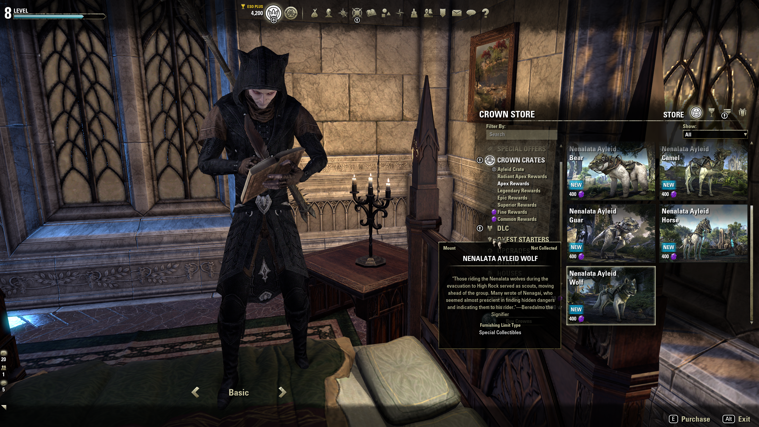 None of the Apex or Radiant Apex mounts from the Ayleid Crates can be previewed in the Crown Store in-game (they simply do not appear, and my character does not change posture, continuing to stand as if the preview function has not been activated); however, all of the other mounts (including those from the lower tiers from the Ayleid Crates) can be previewed correctly in the Crown Store in-game. I am using a Japanese client in English mode downloaded via DMM.com running in Boot Camp in Windows 7 on a Macintosh Pro (I live in Japan). My system currently has 87.8 GB of HD space available, and has 32 GB of RAM; therefore, neither lack of HD space nor lack of RAM can be the issue.