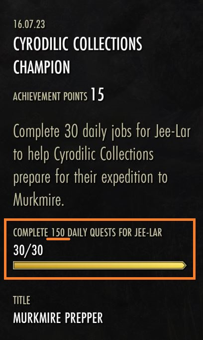 Blood_again wrote: »Lord_Graas wrote: »I finally completed 150 Cyrodilic Collections daily quests a month ago (50 achievement points) and now you've reduced the number of quests by a factor of five (30 quests) and now it only gives 15 AP? This is disrespectful to those players who have come a long way to get this achievement earlier. I think such players deserve a compensation.