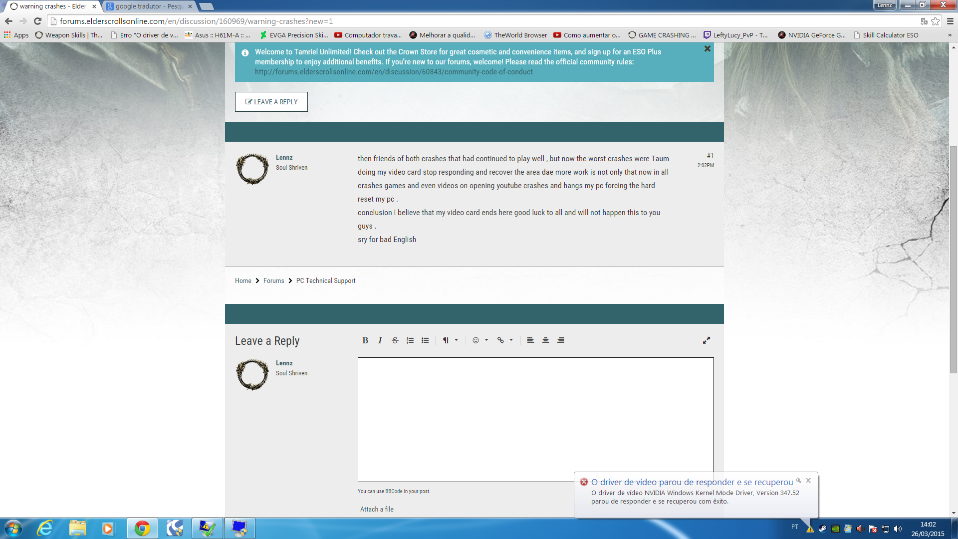 then friends of both crashes that had continued to play well , but now the worst crashes were Taum doing my video card stop responding and recover the area dae more work is not only that now in all crashes games and even videos on opening youtube crashes and hangs my pc forcing the hard reset my pc .