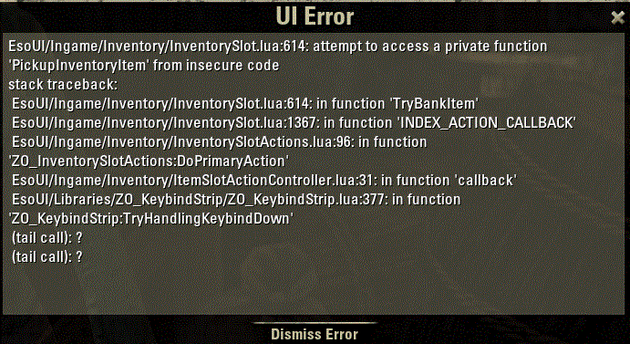 I get the Attached UI error box when trying to deposit any item into the bank, after I have fut items up for sale in guild store. Cannot move item without logging off character and then logging back on.