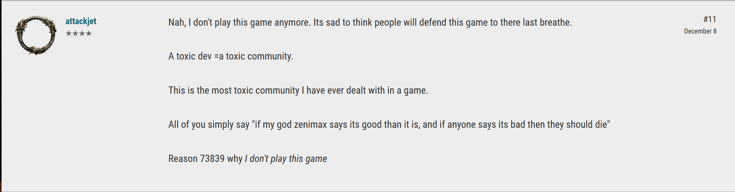 anitajoneb17_ESO wrote: »@attackjet troll farming forum status?