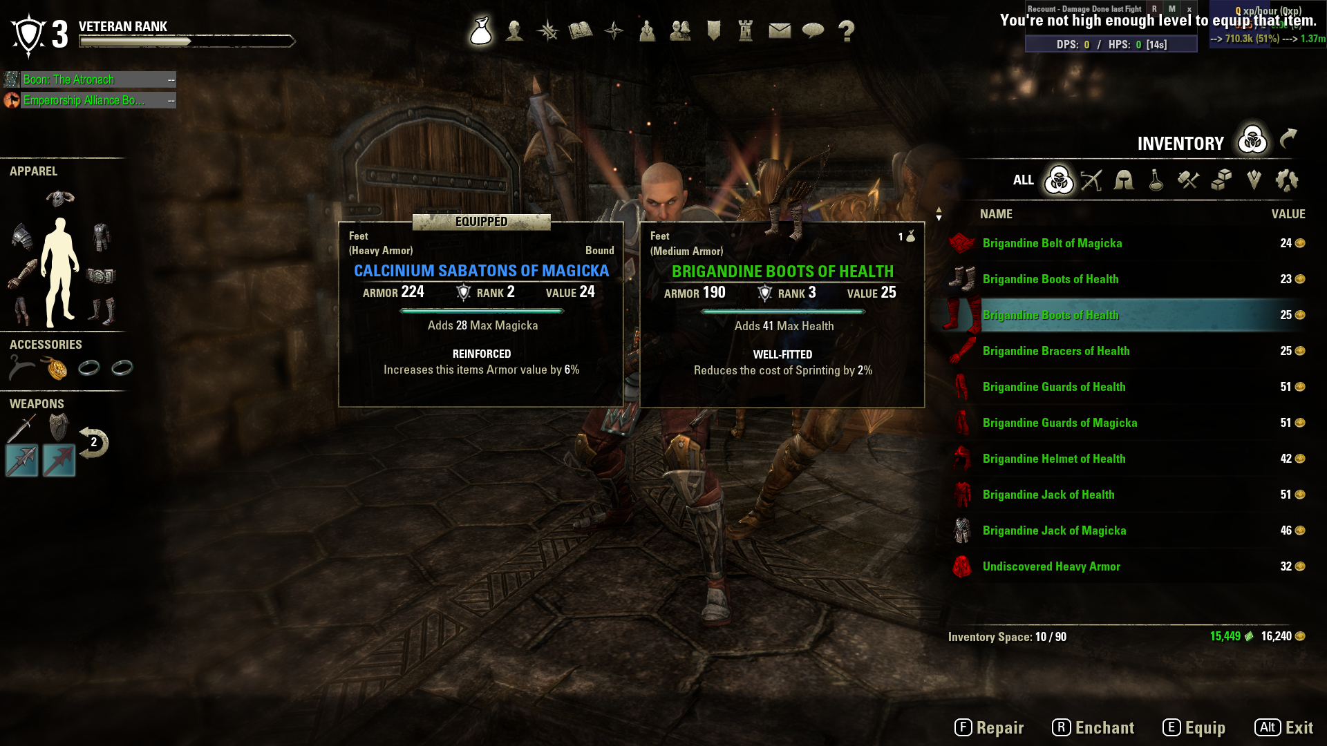 The story is that I want to switch from Heavy Armor to Medium Armor to raise the damage per second my character is capable of. I purchased ~ 10 Exotic Medium Armor Bags from a veteran ranked vendor in Stormhold which is in the zone Shadowfen. Every item was colored in red text within my inventory; however, the tool tips shown while hovering the mouse over each item are displayed in white (The name, armor, VR requirement, and all are white in the box). When attempting to equip the items, the message "You are not a sufficient level to equip this item" appears on the top right of my screen.